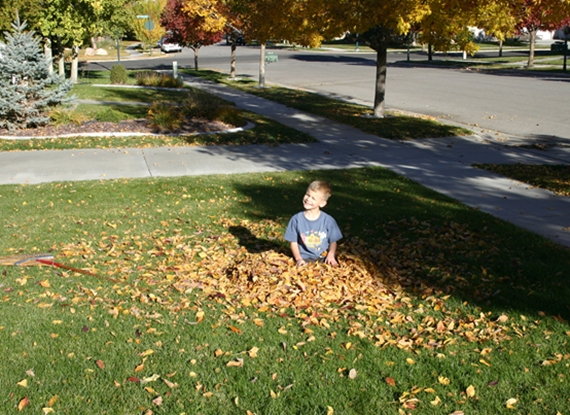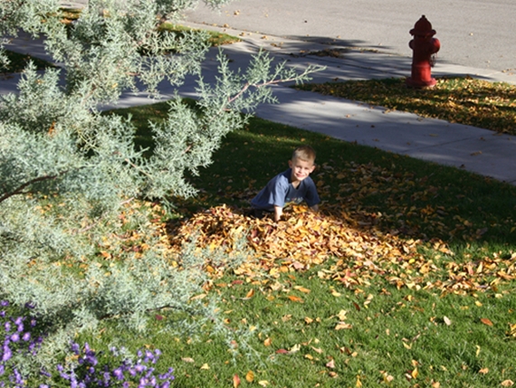 But as is required with children, you must jump in them. (He is actually hidden in this pile!)