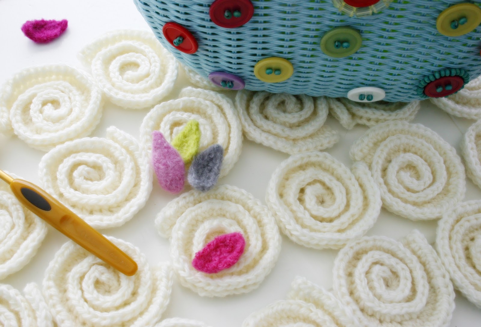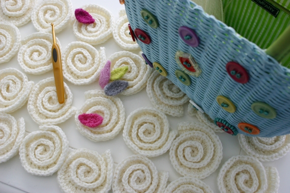 But I can't have just white. I always need a little spot of color. So take note of the little felted leaves. They might make these little swirls just right. Now to put it all together--in my mind and with my hook!