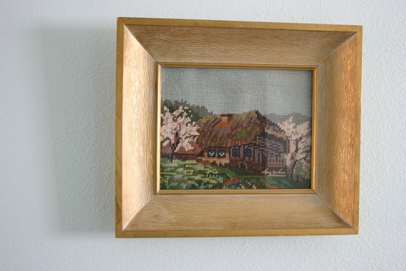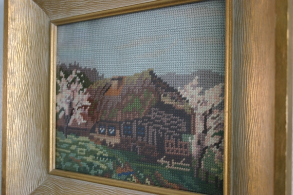 I "rescued" this needlepoint for $2. I always feel so bad when I see handmade items like this there--since I understand how much time goes into making them. But honestly, I bought it for the frame. I didn't love the picture as much as I do now. It is growing on me. I like that I can barely see the faint gray clouds in the blue sky. And the blossoms on the trees make me think of Maryland in the spring where I lived for a short time as a child.
