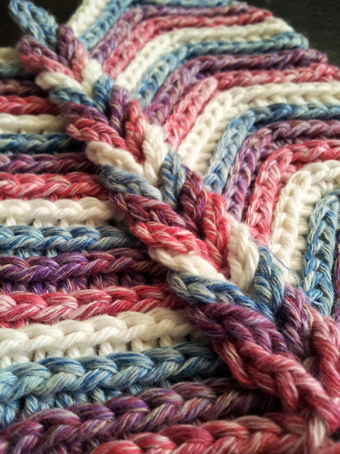 This one was worked up by my tester Christine of Yarnacles. I love the earthy colors! And the contrast with the white really makes the pattern pop! Christine is going to use her little sample shown here as a cowl. Why didn't I think of that!? Brilliant and versatile, I tell ya!