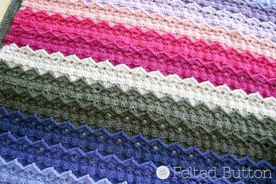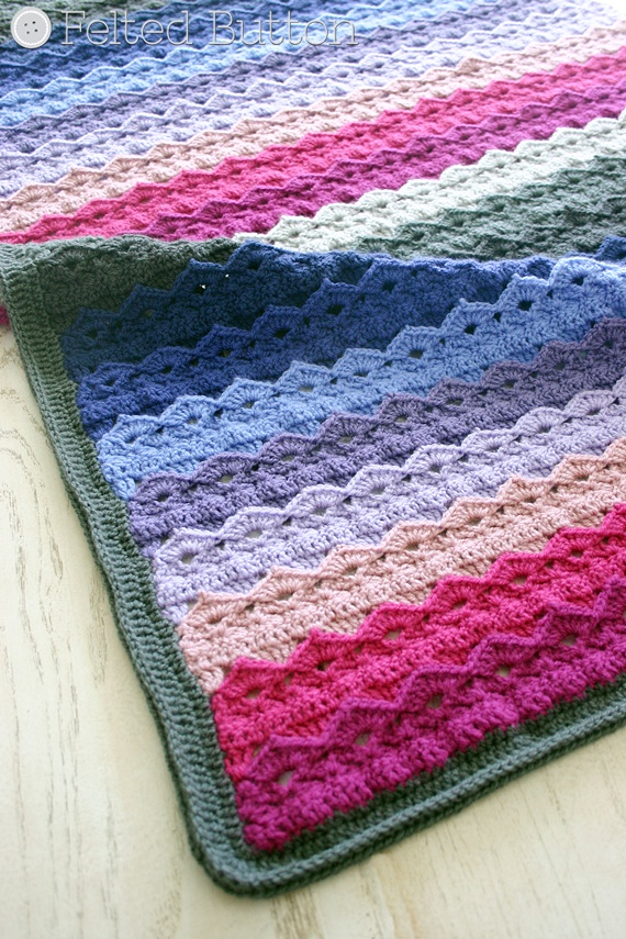 I've included the colors I used, yarn quantities and the multiples number in the pattern so you can make it the exact same size as this blanket (35in X 43in; 89cm X 109cm) , or upsize it nearly 50% using the same number of skeins that I used. If you are interested in getting your hands on some of this gloriously soft, beautifully colored, and affordable yarn--you can find it at Wool Warehouse *here.