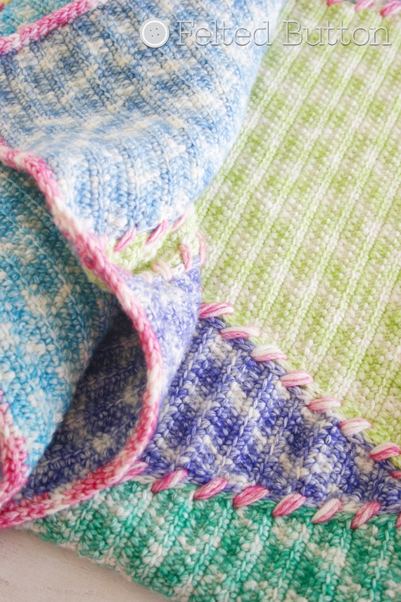 Tell me this wouldn't be fabulous in nautical colors--like pennant flags! Even in all neutral with a pop of color for the whipstitch joins and border. I think it could also be made in any weight/fiber yarn and be quite terrific.
