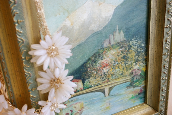 The painting ($1.50) is far from professional--but I simply adore the colors. Scrawled on the back it reads, "A memory from 1973, Southern Italian Alps" and it was painted by Blanche Hansen.