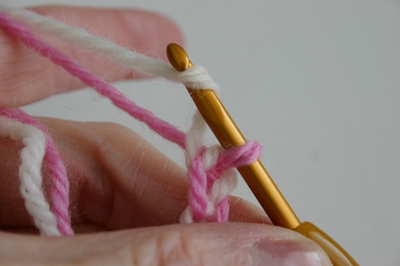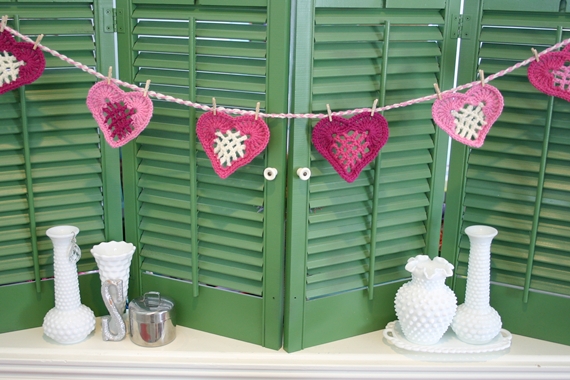It also has instructions for making the hanging chain, a fun little chaining method I just came up with today. It has probably been done before but I have never seen it. I made it by holding two colors together and then 'taking turns' completing a chain stitch with each color. (It looks so much tidier than chaining with both of them together, as the strands blend unevenly--know what I mean?). I made mine about 52" (132cm) long but you can make yours any length you wish. Then I hung my hearts on the chain using mini clothes pins--2 for each heart. Easy peasy.