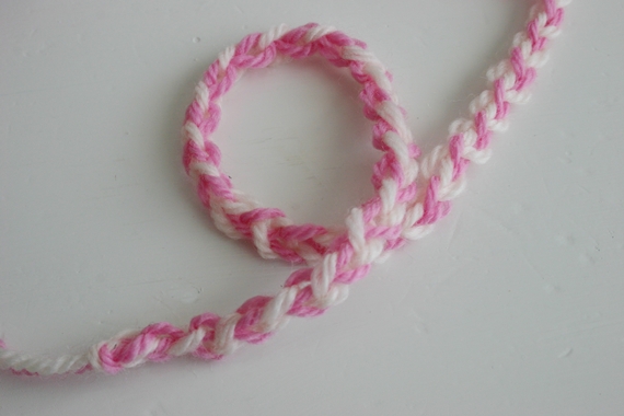 - Yarn: I used small bits of each of the following: Paton’s Classic Wool—Colors: Magenta, Winter White & Orchid and Stitch Nation Washable Ewe—Color: Icing