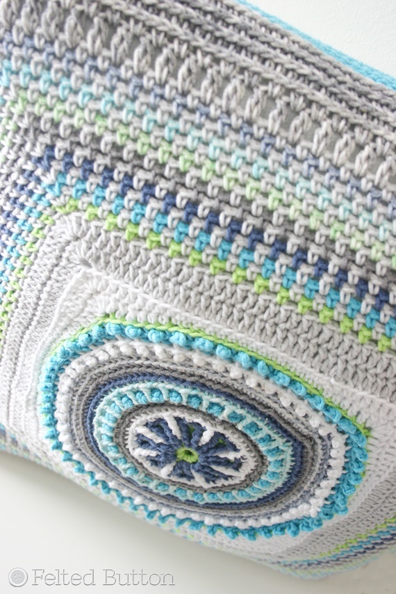 I used about 890 yds (815m) of DK cotton blend yarn for each cover (Scheepjes Softfun and Softfun Aquarel) and a G (4mm) hook. You'll also need a 20" (51cm) square pillow form and 5 buttons for the back closure. You can read more about skill level, yarn quantities, and pattern details on the Felted Button listing here.