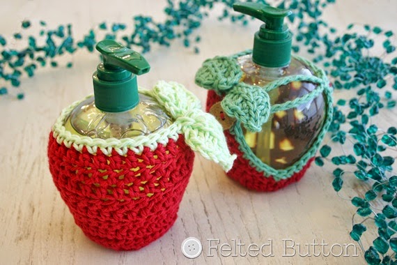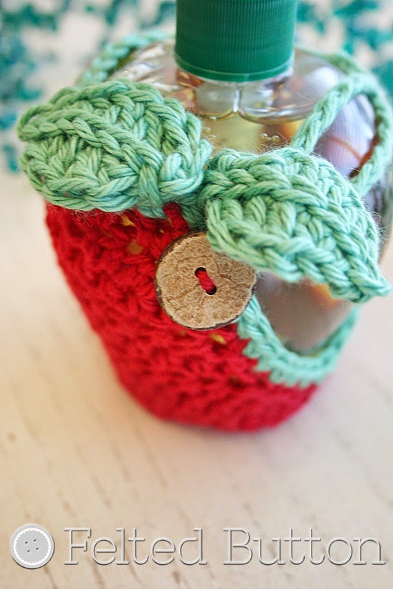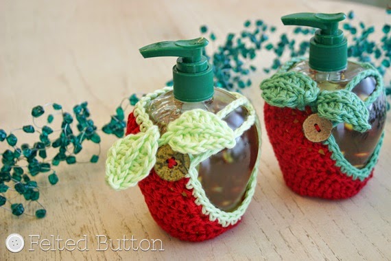Red apple cozy for apple shaped soap dispenser with wooden button, crocheted by Susan Carlson of Felted Button | Colorful Crochet Patterns