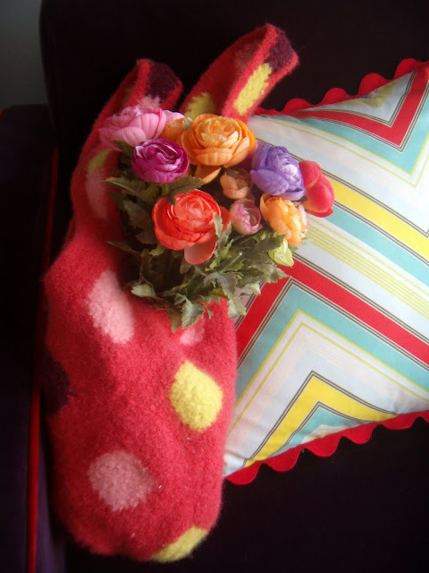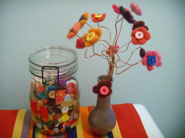 One day while at the local thrift store, I came across a fabulous red locker for Luke. Oddly, it was identical to one I had purchased several years ago at the same thrift store in a different city. Now I have a matching pair that I plan to use as nightstands, screwed into the wall, as soon as we retire Luke from the toddler bed. Inside the locker was a bundle of copper wire. Since I can't let a cool thing, or even a dumb thing, go to waste, I made it into this felted flower bouquet. Buttons needed to be added, of course, since everything is better with buttons, right?
