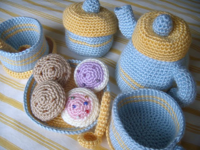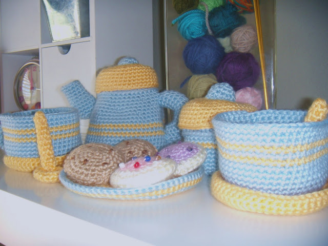 A very poor picture of a little tea set I have made for my nieces, with chocolate chip and sugar cookies to boot. It's not great for actually playing with, though, since the fabric is pretty bendy which makes it hard to fit on the lids.