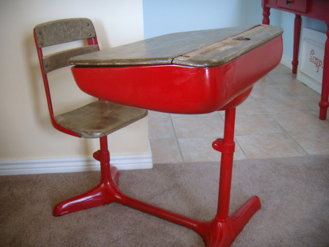 An awesome little red desk, discovered for six dollars at the thrift store. It was distressed gray and COVERED in stickers. A little red spray paint, and TA-DAH, a cute little vintage desk for Luke's bedroom, that is, when I finally decide how to paint and decorate it. (The desk even has a hole for an ink bottle!)