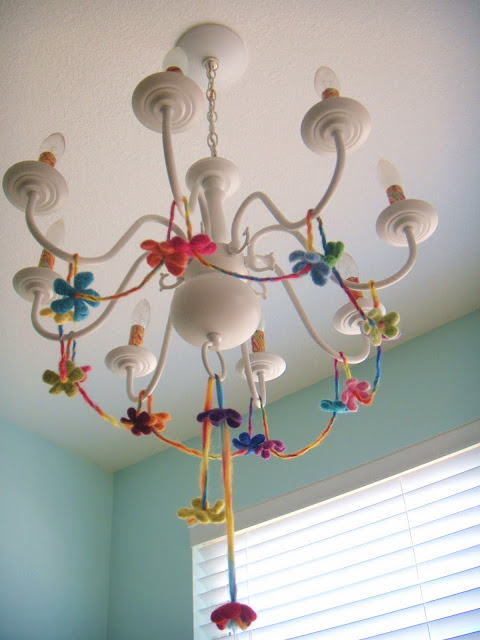 This fixture started out in my sitting room--brass and boring. A little spray paint, scrapbook paper over the candle sleeves, and a colorful felted garland, I almost love this light now!