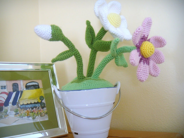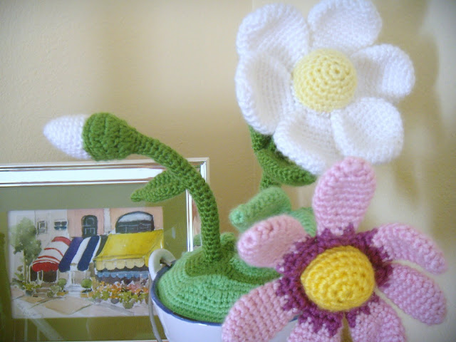 A pot of flowers--amigurumi style. I even made "soil" and it fits perfectly in this pot that reminds me of Newport Beach.