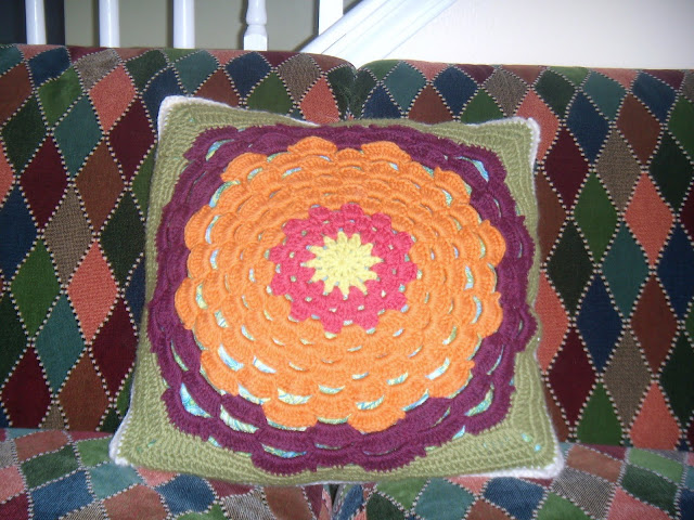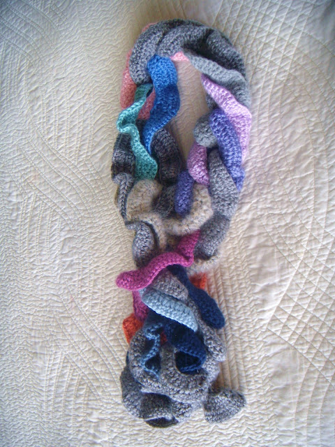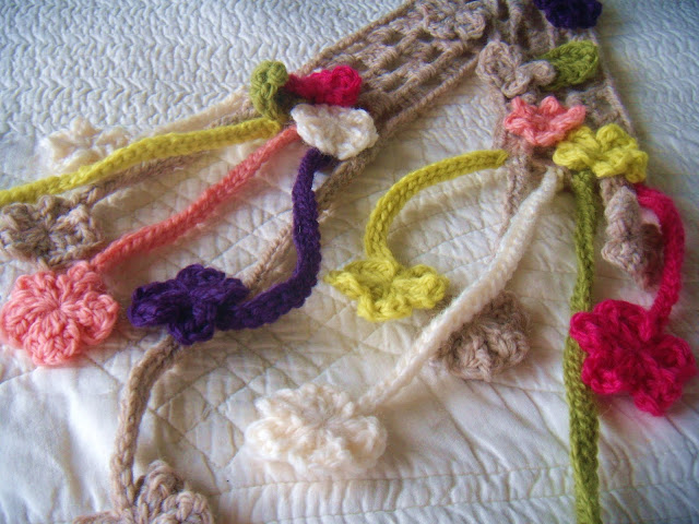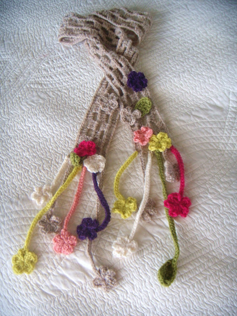 I copied the pattern for this from a picture I found somewhere. Now I can't find it. If you see something around similar to this, please let me know. I considered felting the flowers but decided against it--I like the length as it is. Now I'll have to wait several months before I can wear it!