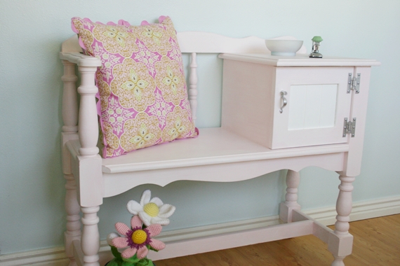 I'm done! And I'm quite pleased. This is the first time I have used a glaze--thanks Karie for helping me learn about how! I painted the bench white and then coated it with a soft pink glaze. It suits me so much better.