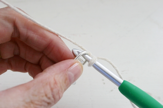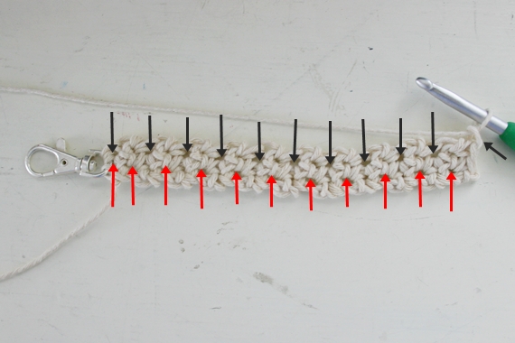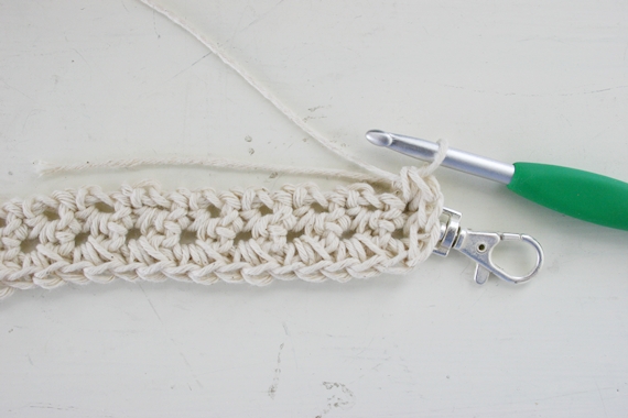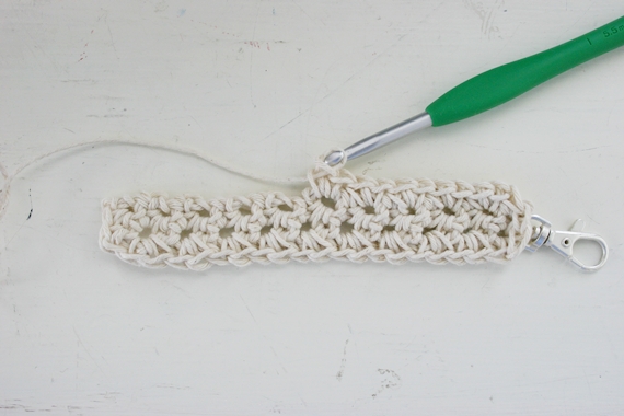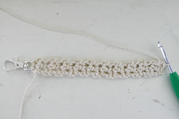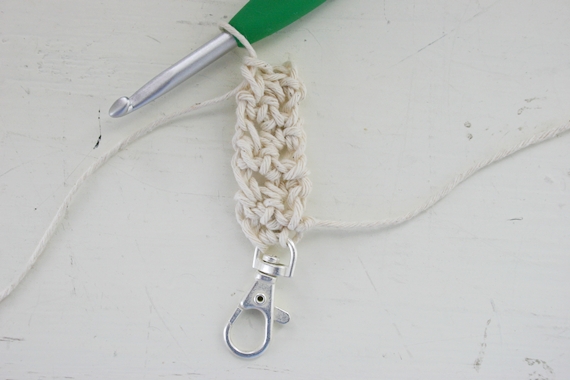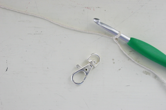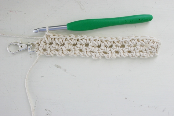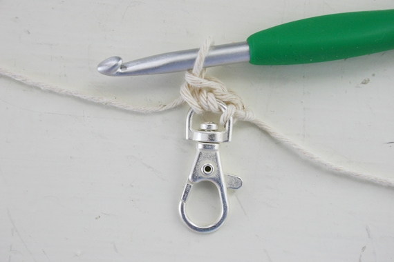 If you have a tough time fitting your hook through the ring on the clasp, insert a smaller hook, yo, and then switch to the larger hook before completing the sc.