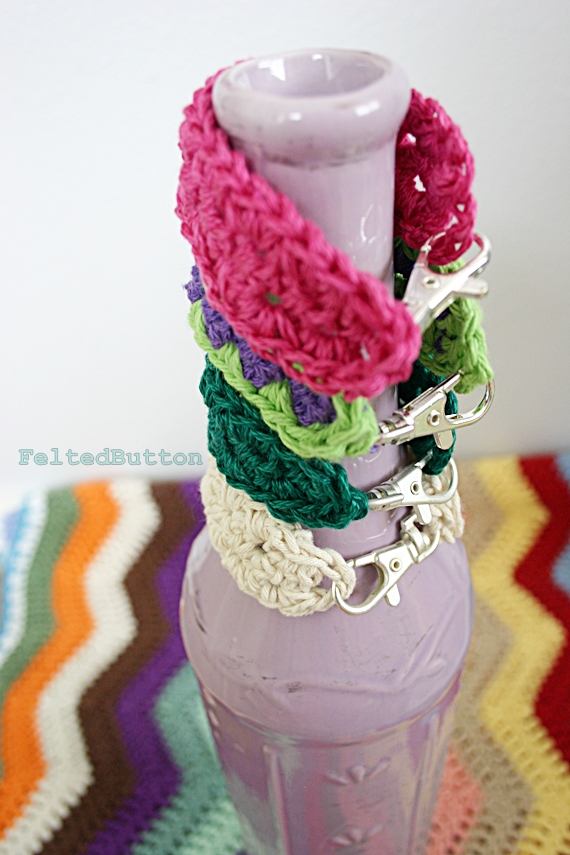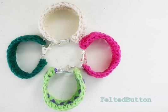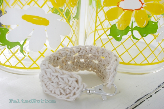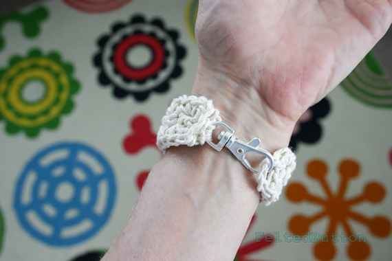 Notes: The twine and larg-ish hook size produces a bracelet with a little stretch so consider this as you determine the length. Also, you can use the little jump ring for the clasp to connect with, but I didn't as I didn't have any pliers with me and the little clasps rotate to lay pretty flat on your wrist without it.