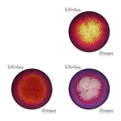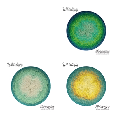 Speaking of color combinations, I even took a gander at the new Scheepjes Whirligig* yarn. It's a Whirli-GIGANTIC cake (450g/1000m) of the most glorious wool/alpaca DK yarn. Whilst dreaming about a Trio Blanket made with this heavenly stuff I came up with some color combos.