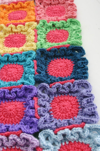 will hopefully have it finished this week. The pattern needs some tweaking but I'm loving the ruffled edges and big neon centers. I also love the way that it is joined, although it is not quite finished yet.