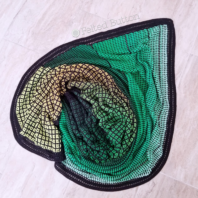 I decided on the name because the first panel which is made with the intermeshing technique makes little 'windows' on both sides of the fabric where you can "peek through" to see the lovely color gradient of the Scheepjes Whirl. It's really got a great stained-glass effect, I think. I used one cake of Whirl in the color Key Lime Pi for the windowed panel and a second cake from the Ombre Collection called Murderous Mint for the other half of the blanket The black is Whirlette in Liquorice and provides a great contrast, methinks. I used 5 balls of that.
