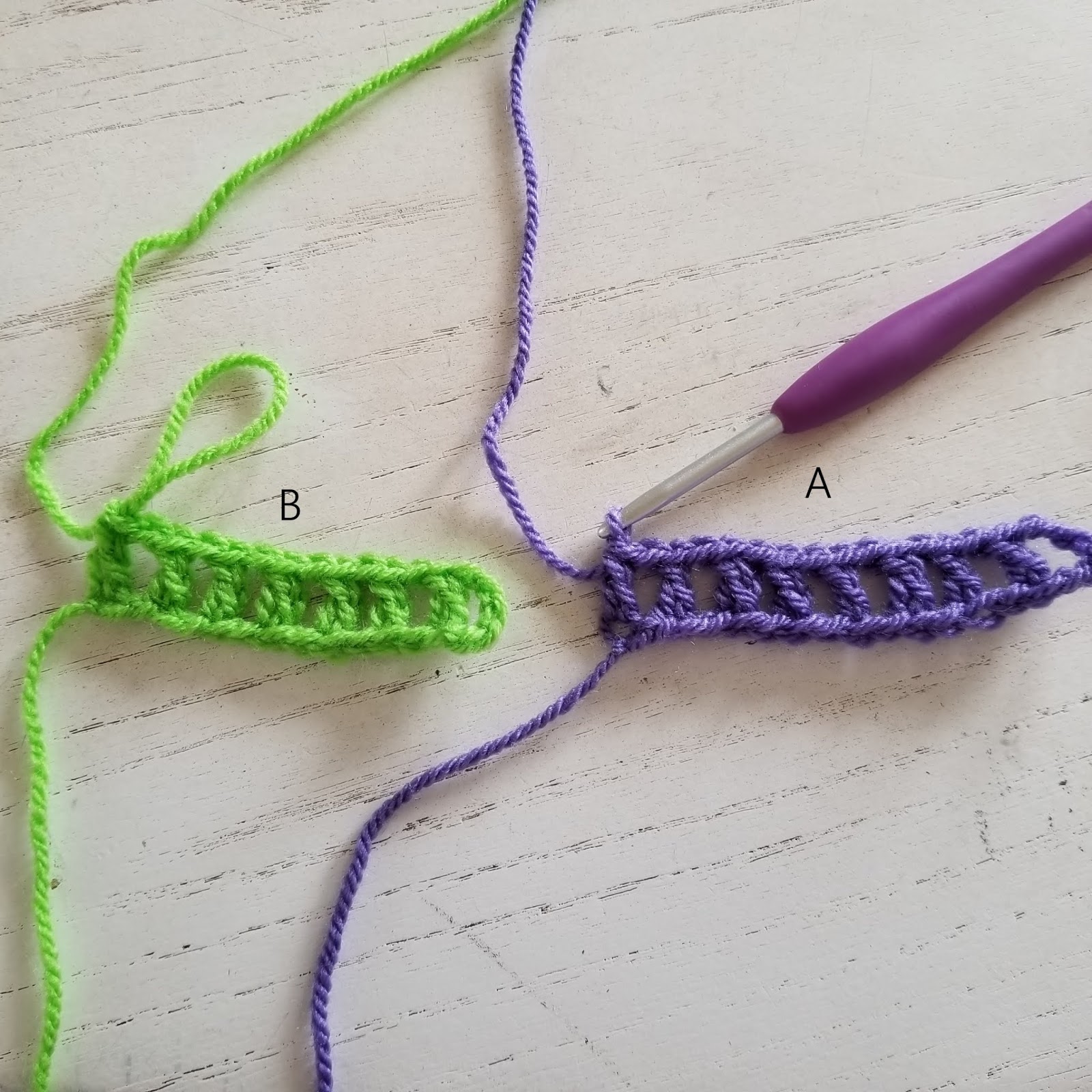 This gives you another view of A that is worked behind, not over B. They are interwoven but never actually crocheted into one another. Also remember to always ch 1 between each dc. This is mesh, right?