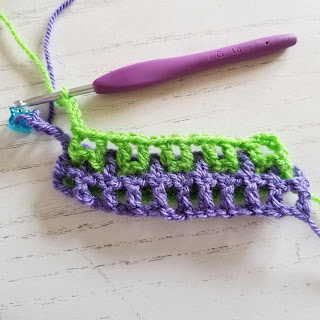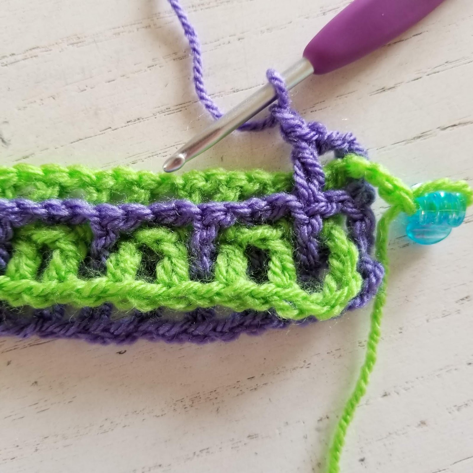 Row 2a (WS): With A, dcf in next dc, *ch 1, dcb in next dc, ch 1, dcf in next dc; rep from * across to last dc, ch 1, dcb in last dc, ch 4, drop A, do NOT turn