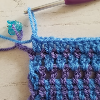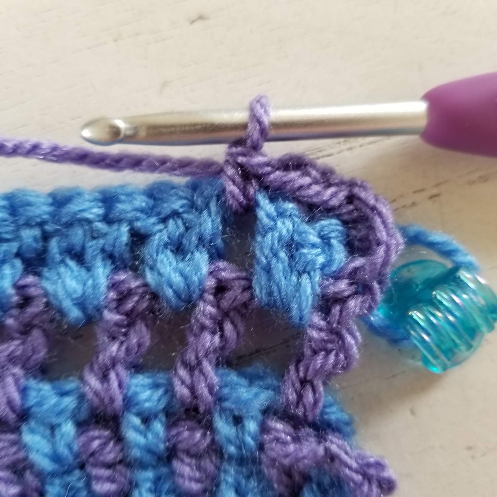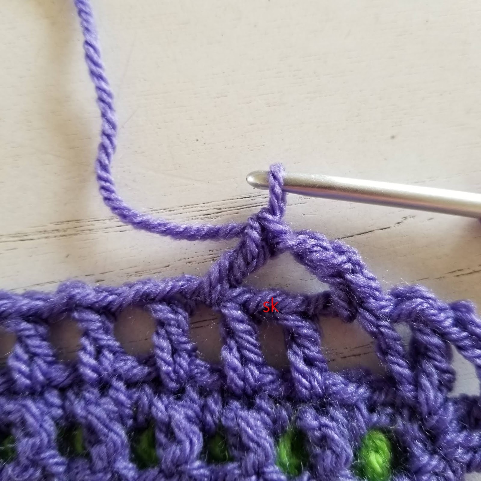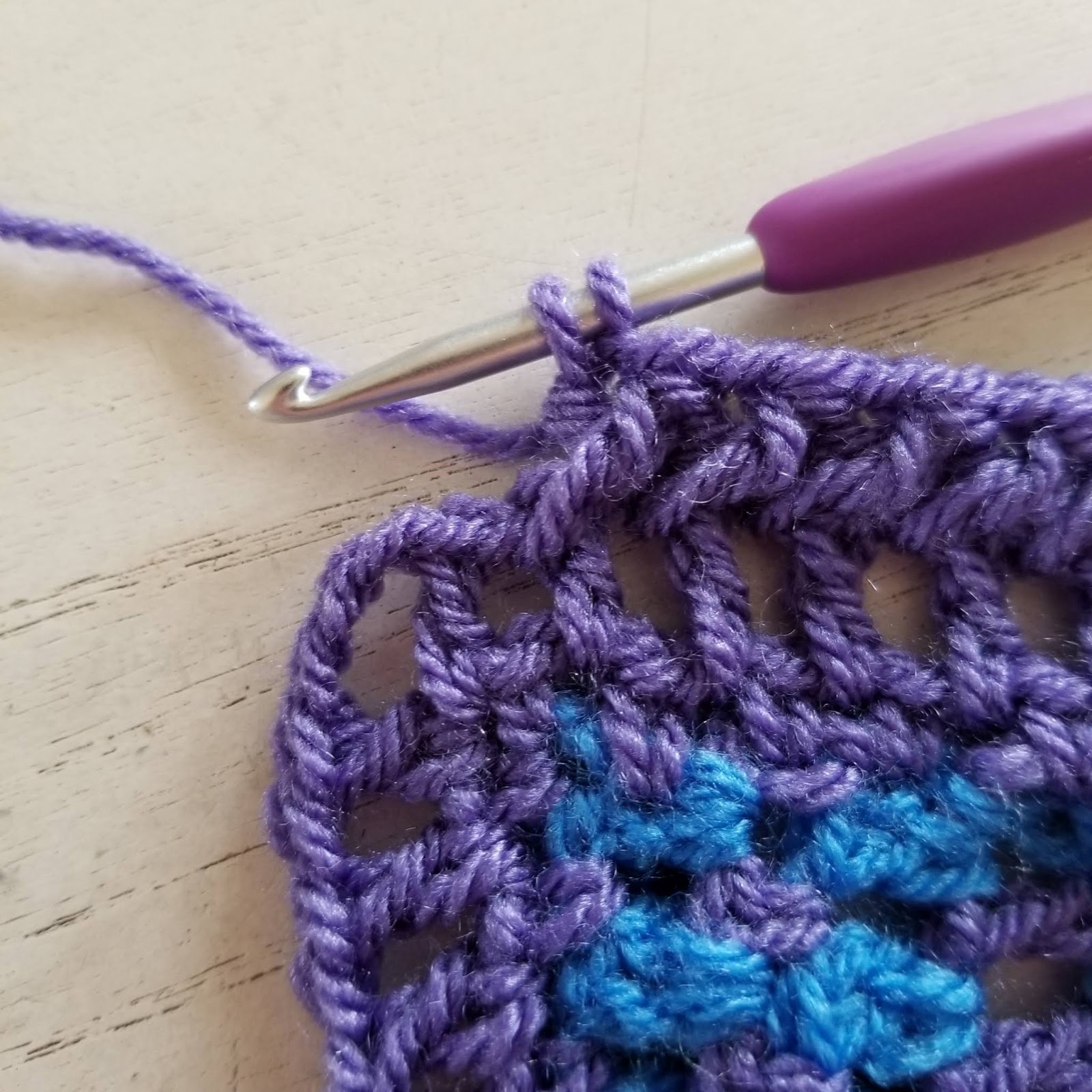 Row 3b: With C, (sc in next ch-1 sp, ch 1) rep across, ch 2, drop C, turn