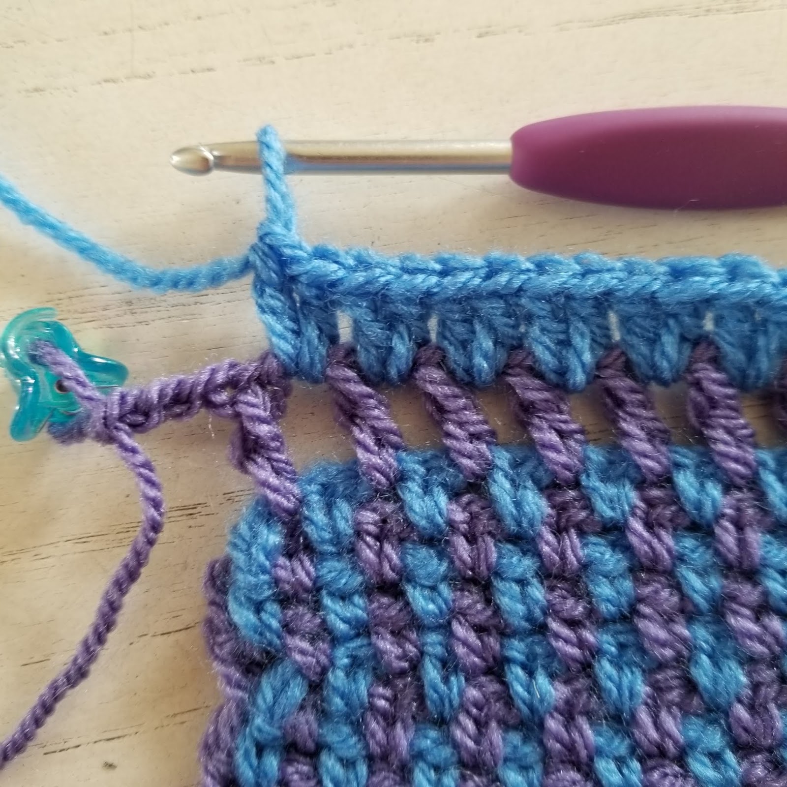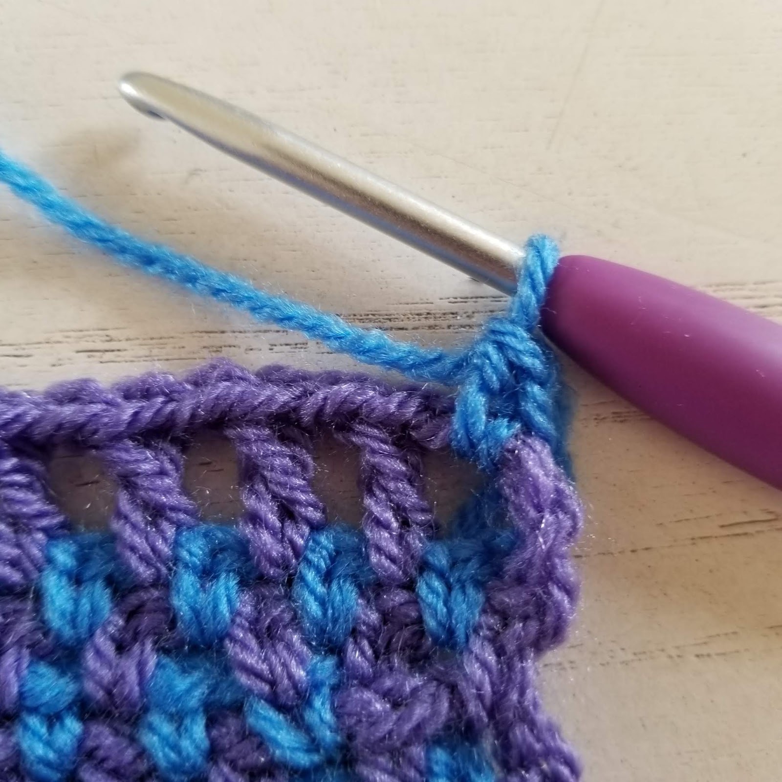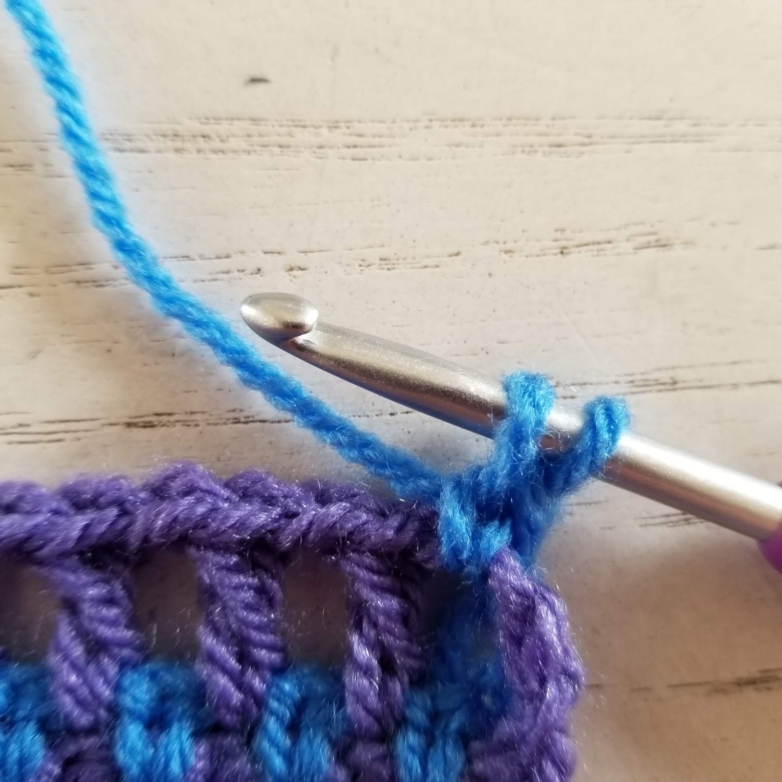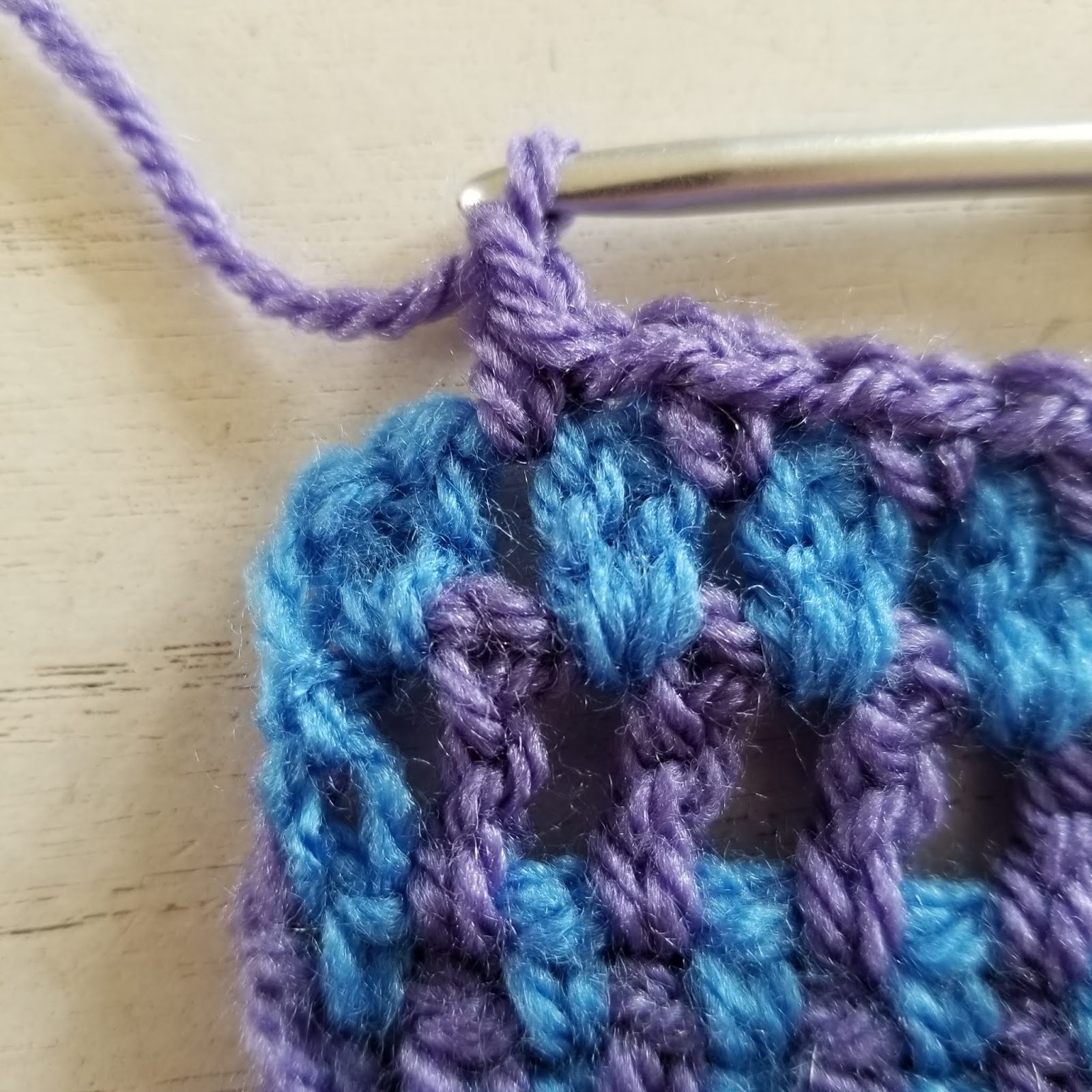 Row 2b (WS): With C, (sc in next ch-1 sp, ch 1) rep across, ch 2, drop C, turn