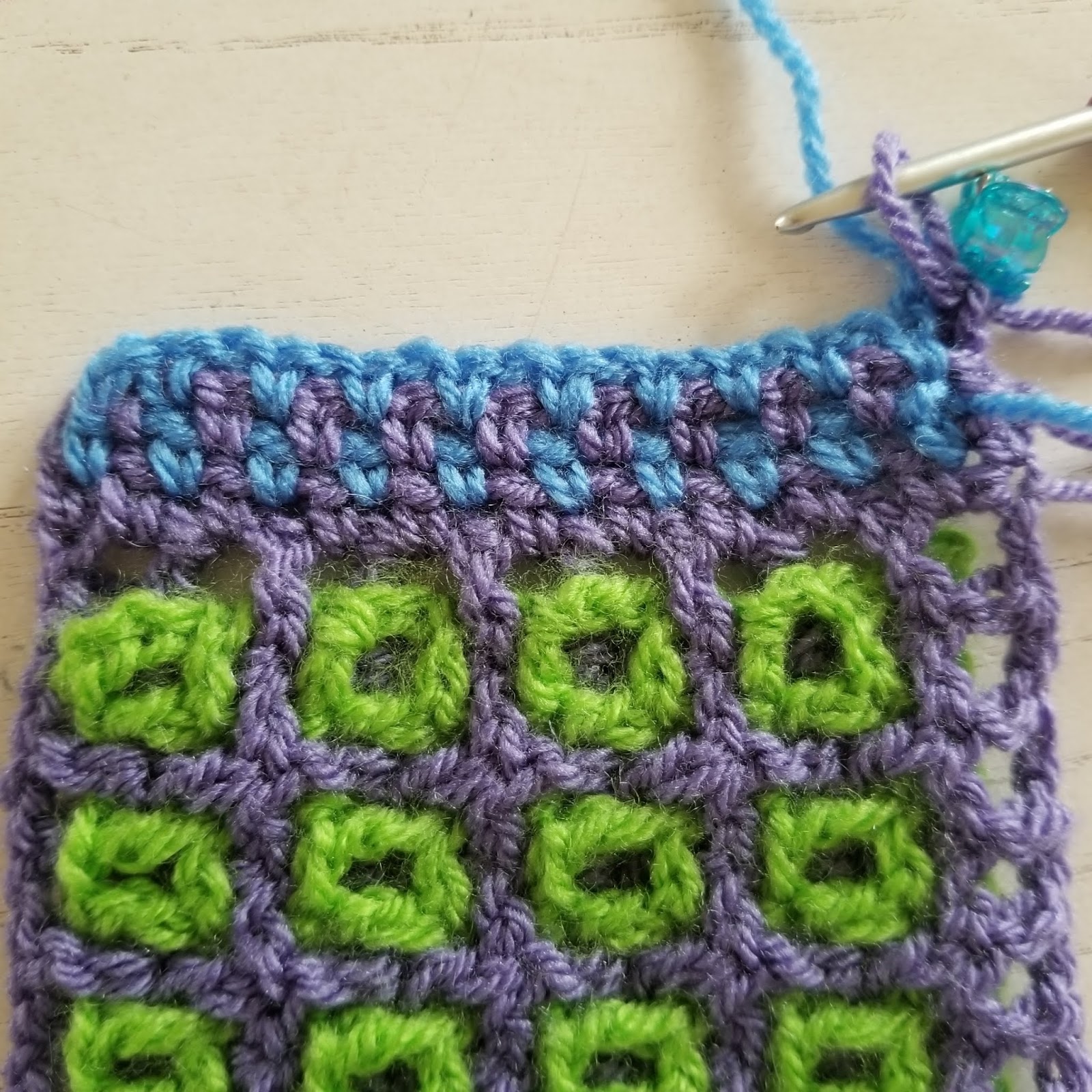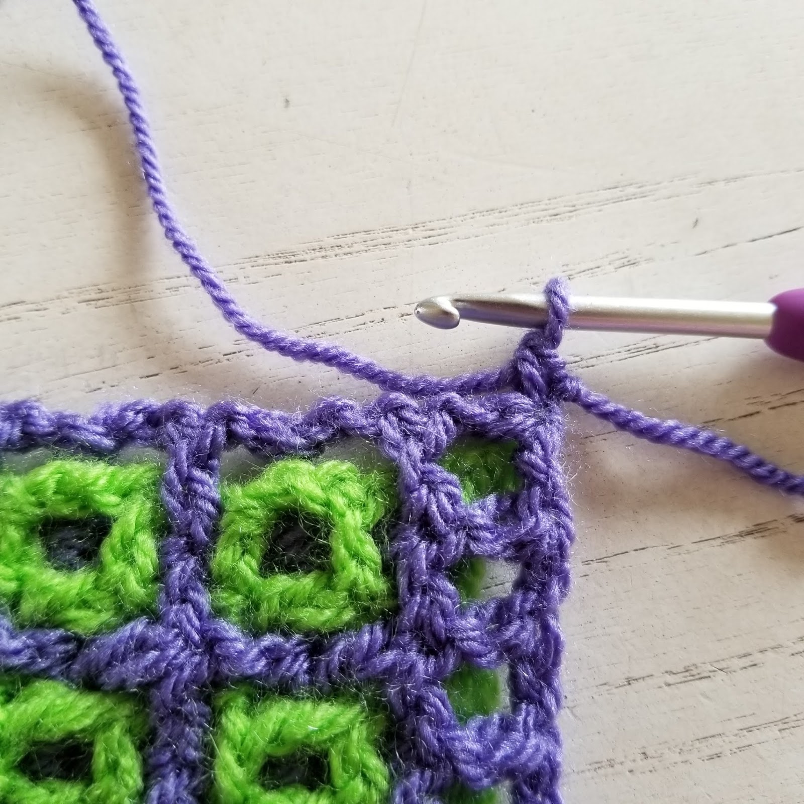 Row 1a (RS): With RS facing and using A, join with sc at bottom of intermesh panel, ch 1, sc in first window, ch 1, (sc in next window, ch 1) rep across, sc in corner, ch 2, drop A, do NOT turn (77 sc and 76 ch-1 sps)