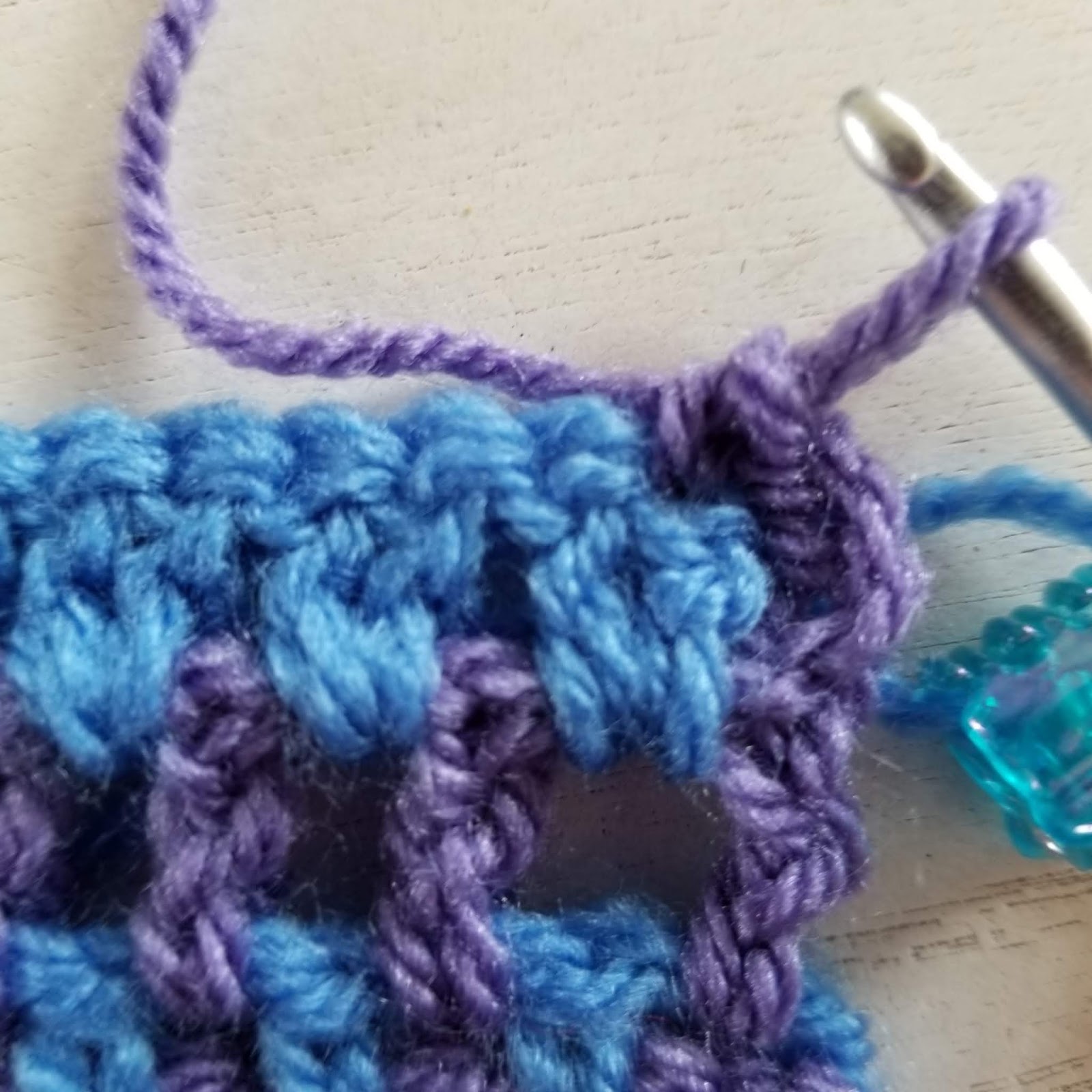 Row 2a (WS): With A, (sc in next ch-1 sp, ch 1) rep across, sc in first sc of A 2 rows below, ch 2, drop A, do NOT turn
