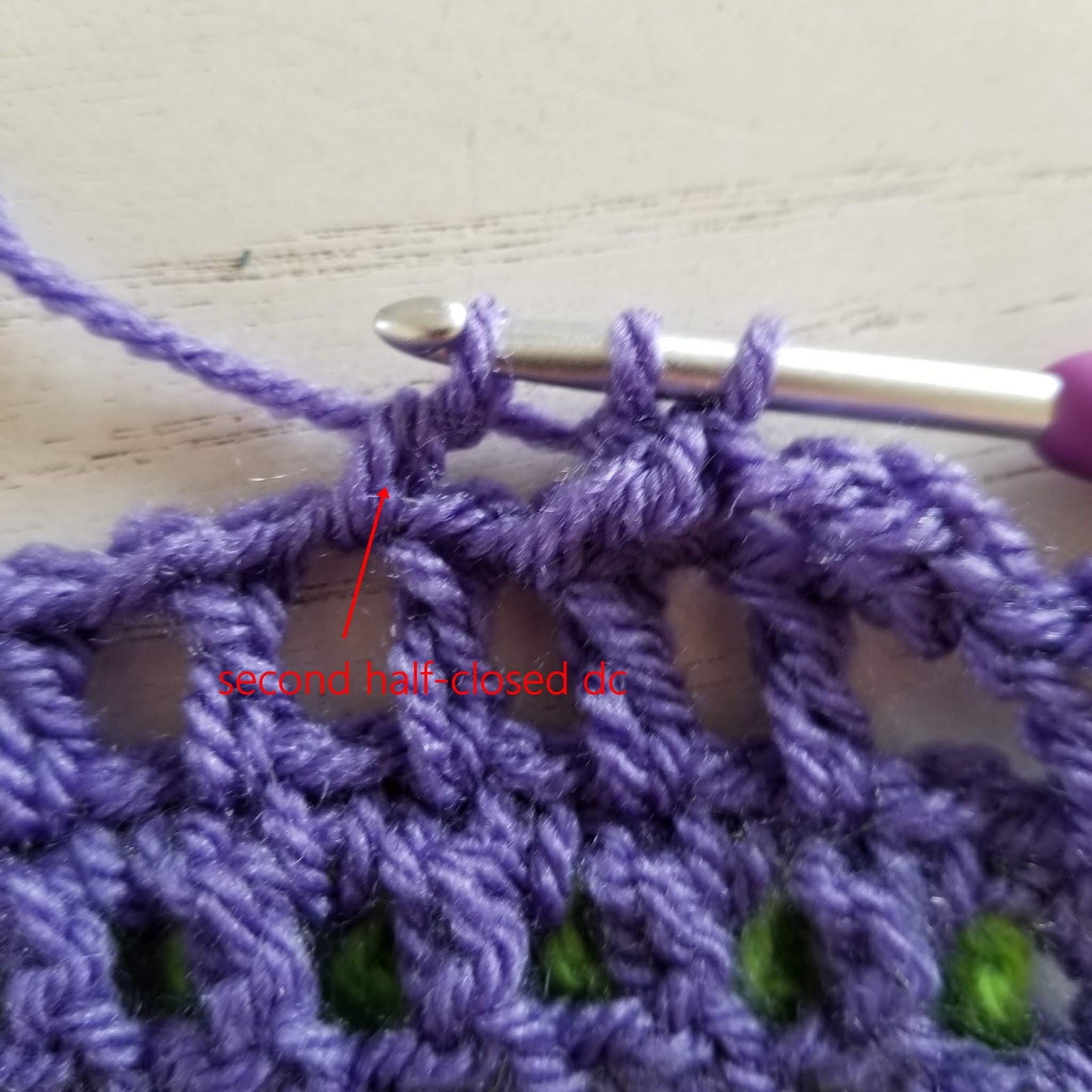 Your first half-closed dc will then be worked in that skipped ch-sp--but behind the previous dc.