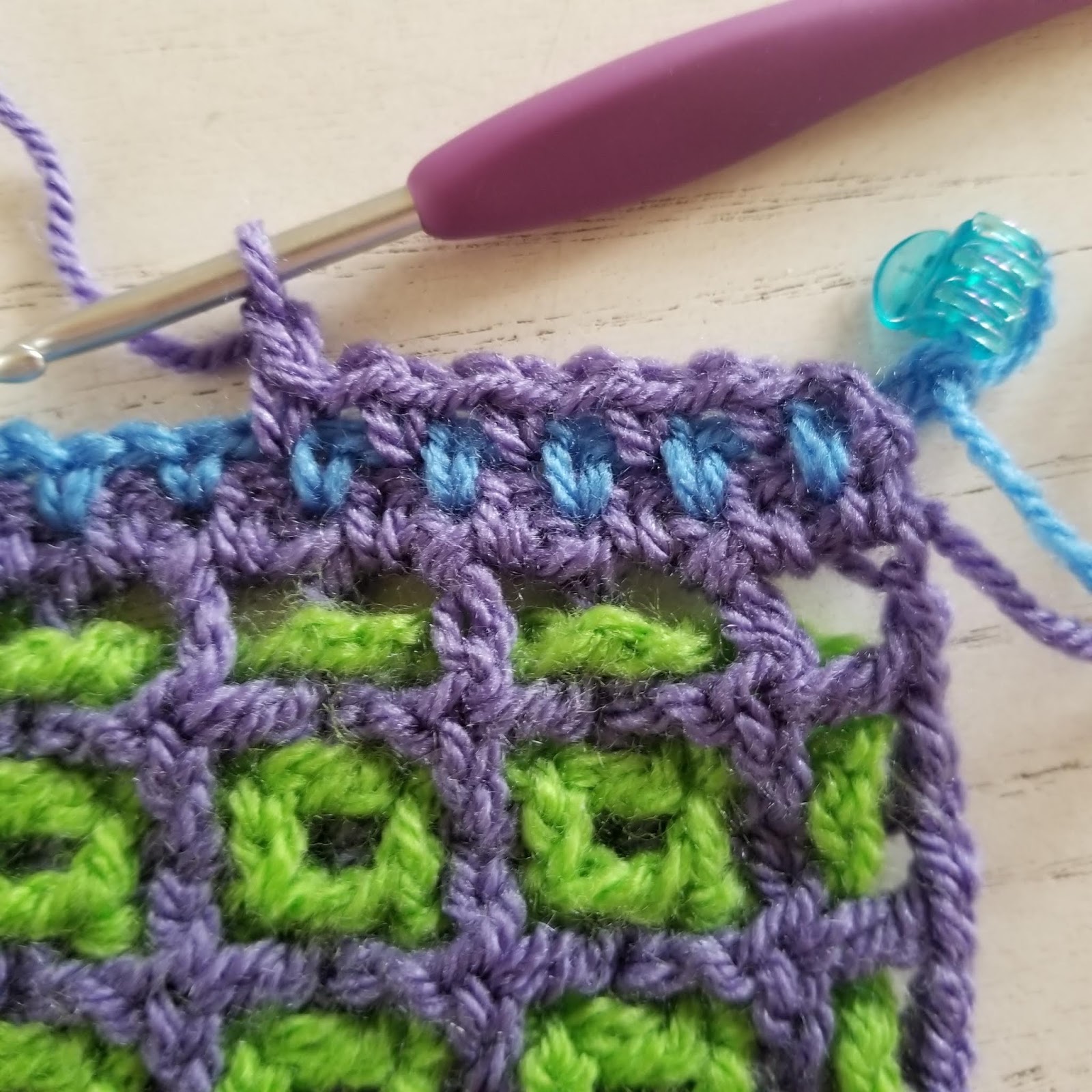 Tip: Use loose chains between sc or use a 4mm hook. Worked lengthwise along the right side of the Intermesh Panel alternating A with C. Always drop your non-working loop to the BACK before beginning with a new color. Ch 2 counts as sc, ch 1.