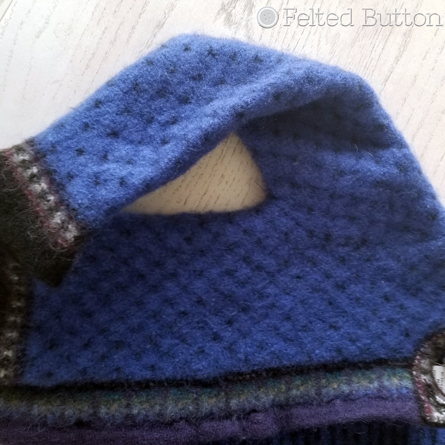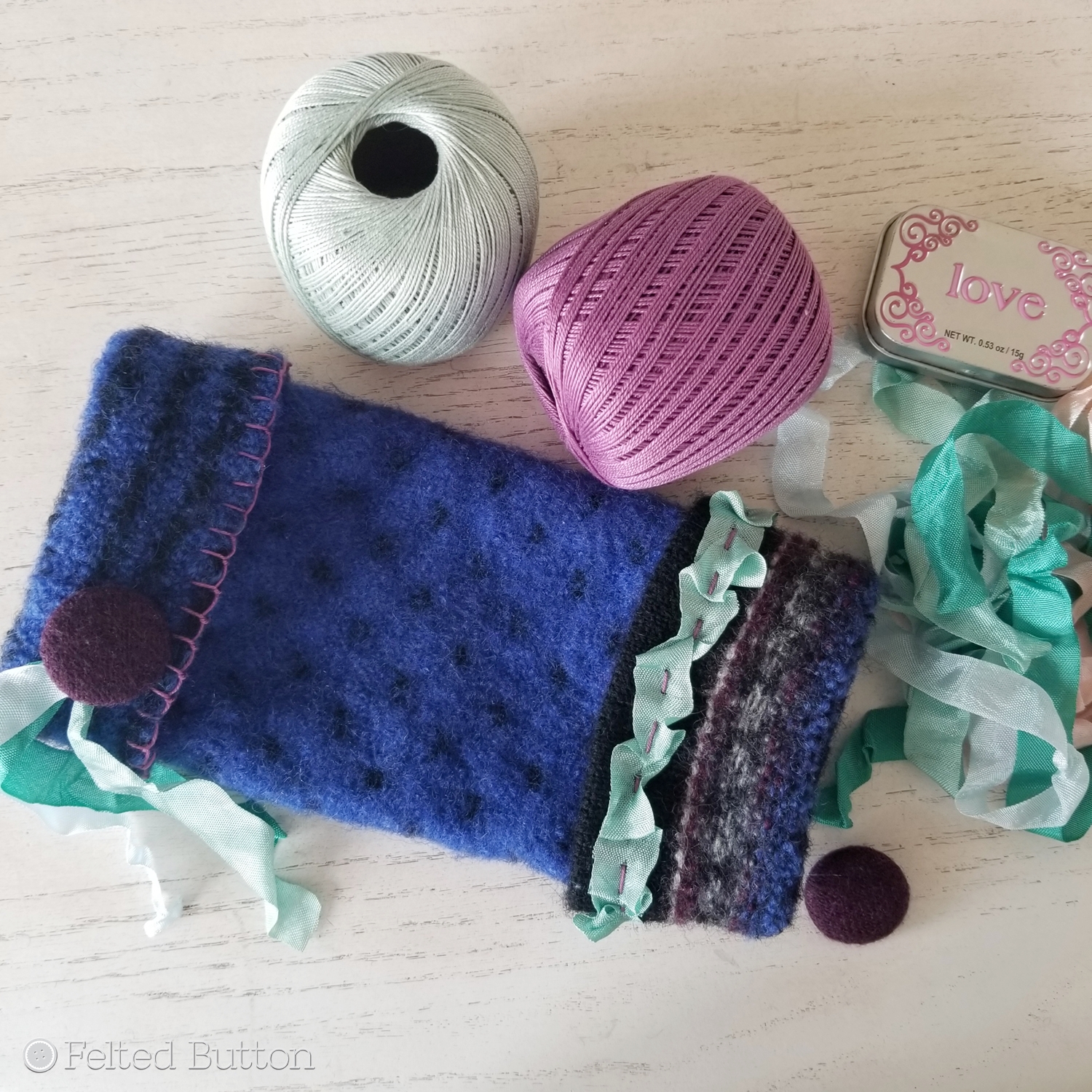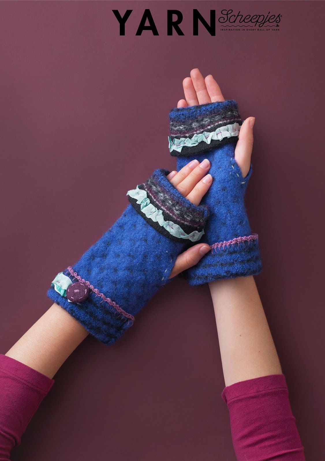 Ever since discovering the magic of felting, I'm honestly gleeful when I get to create anything with the technique. Recently I was asked to design a pair of felted mitts for the newest issue of Scheepjes YARN Book-a-Zine Tea Room*. Off to the thrift store I scurried to find the perfect wool sweater/jumper that could be upcycled into some handwarmers. Needless to say, I hit the jack-pot with a beautiful blue and purple vintage fair-isle cardigan! But let me show you the mitts first, in all their felted and finished glory.
