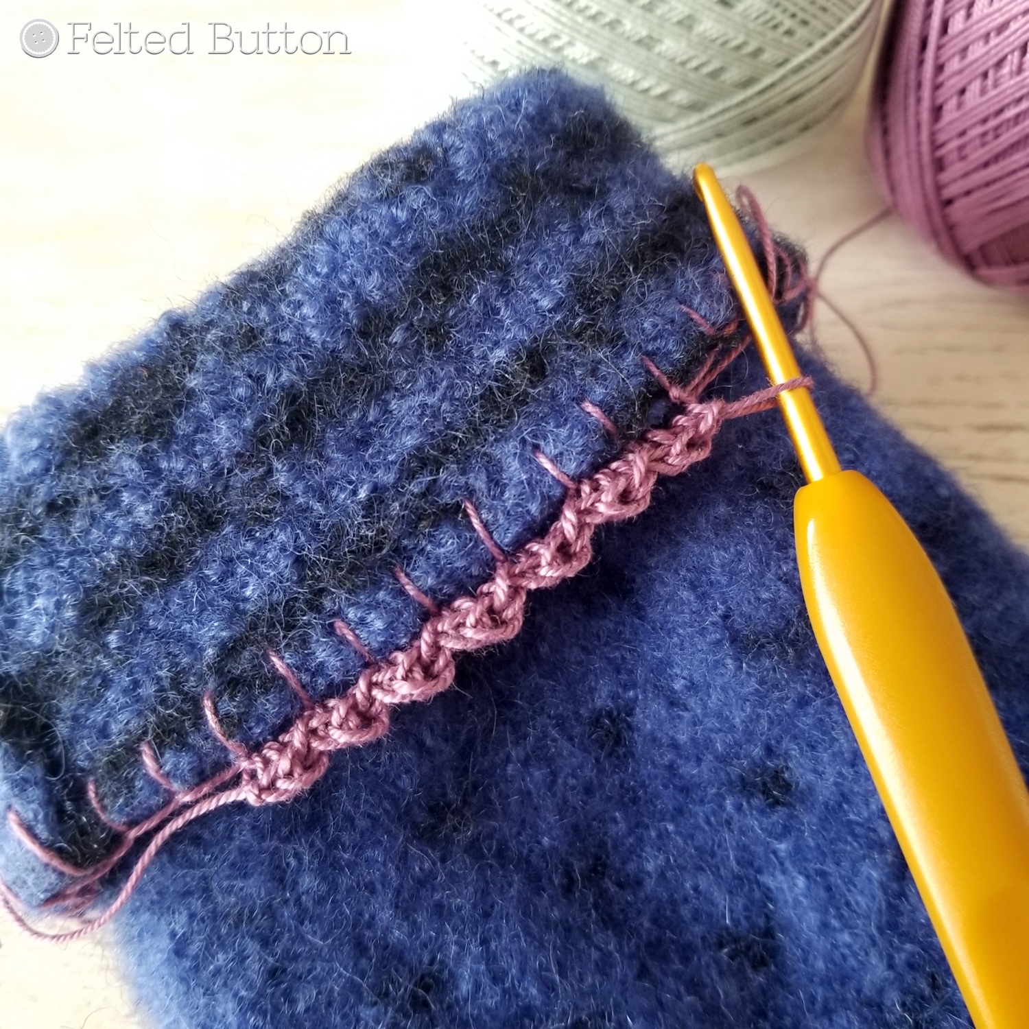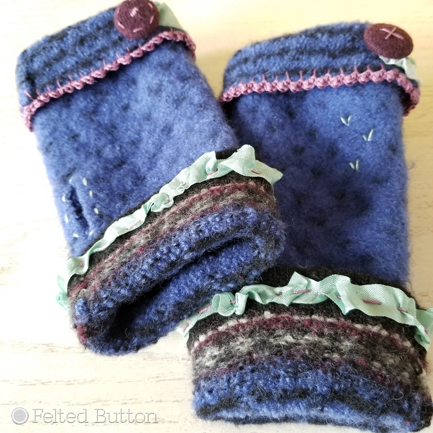 Then I decided to fold the wrist end down about 1.5 " (4cm) to show off the neat lines created from the fair-isle stitching of the sweater. I like the contrast that it presents against the wee "v's" on the right side of the fabric. The buttons which I cannibalized from another felted sweater in deep purple were perfect--not only because of their color, but because they could also be embroidered. Now let me share with you how I completed the crocheted detail at the wrist end of the mitts.