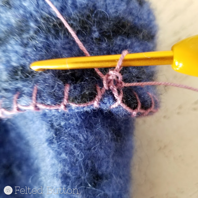 After my blanket stitch is complete, I use it as a foundation for crocheting my little scalloped edging. (Don't worry about right or wrong side here--it looks awesome on both sides.) Here's how I did it (US crochet terms):