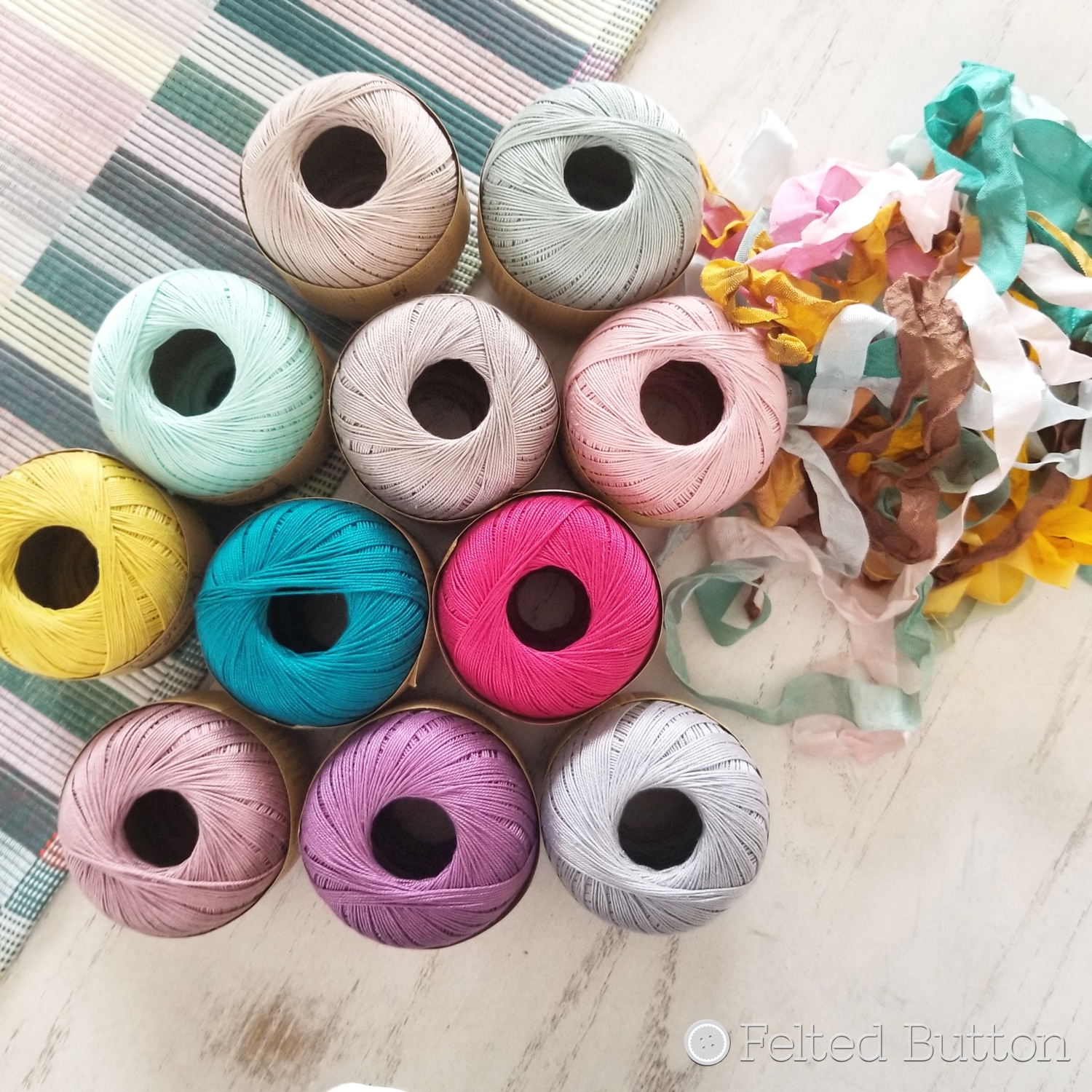 After gathering some supplies like Scheepjes Sweet Treat* for some impromptu embroidering on the mitts, some silk ribbon scraps, scissors, measuring tape, 3mm crochet hook, chalk, needle, and buttons stolen from another wool cardi, I was ready.
