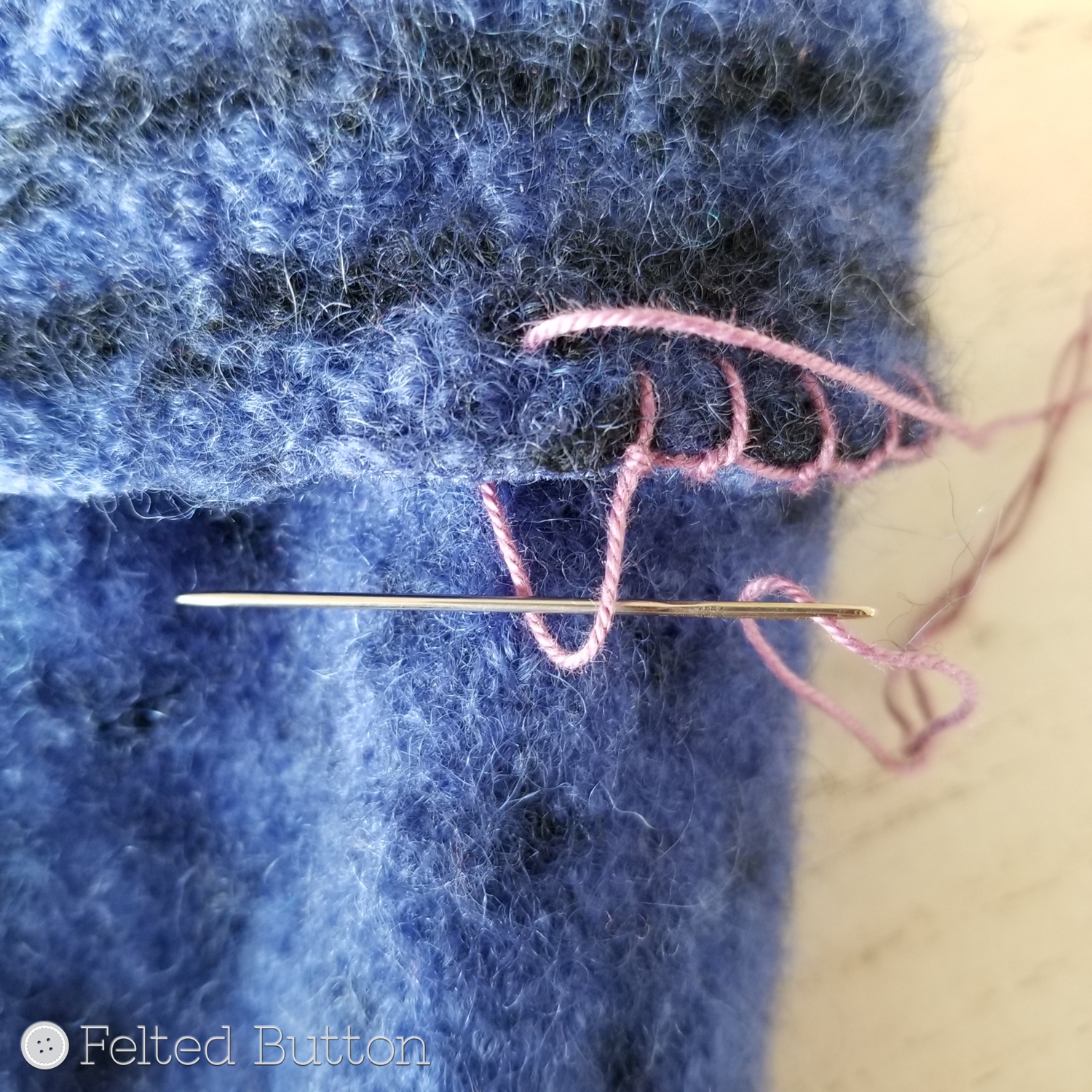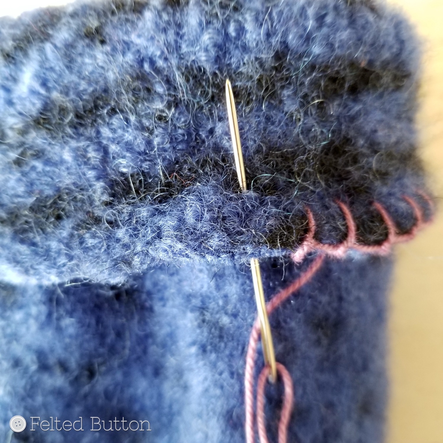 I started with a blanket stitch. Insert your needle as shown above--under the cut edge to about .5" (1.25cm) from the edge.