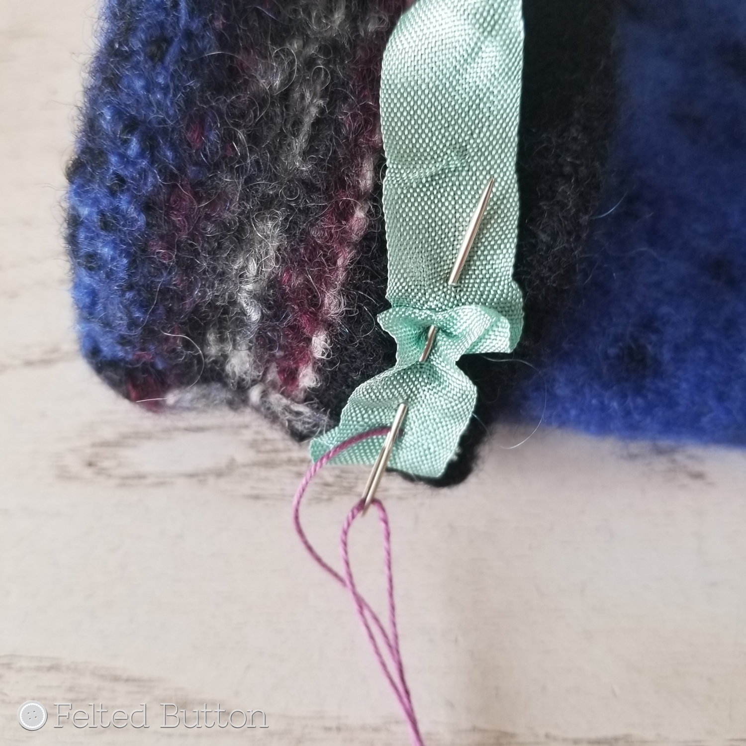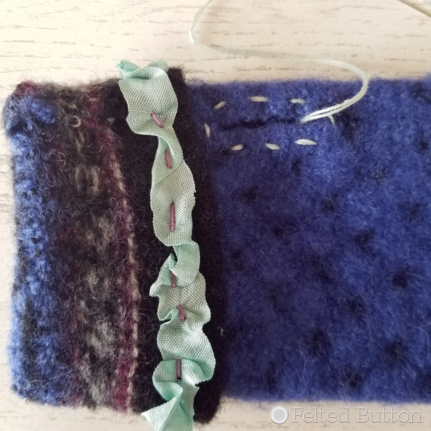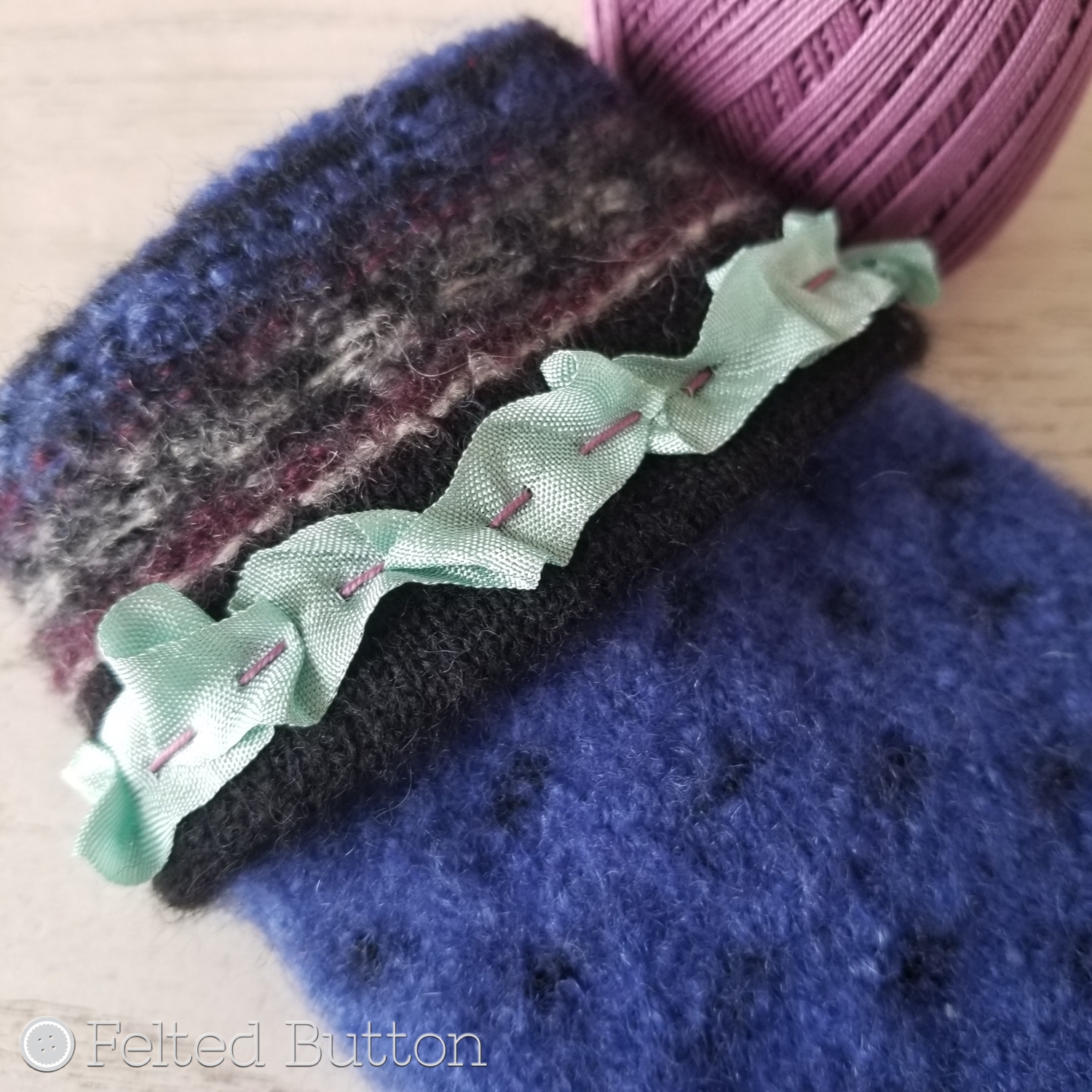 Then using another contrasting color of Sweet Treat--this one matching the ribbon, I did another simple running stitch around the thumb hole. Keep in mind, this is only decorative because the felted fabric is so durable, it will not split or fray when cut--did I say magic?